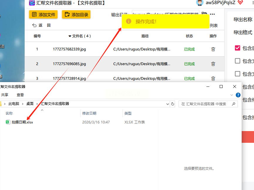 完成后打开文件,可直接看到文件名与对应拍摄时间的清晰列表。