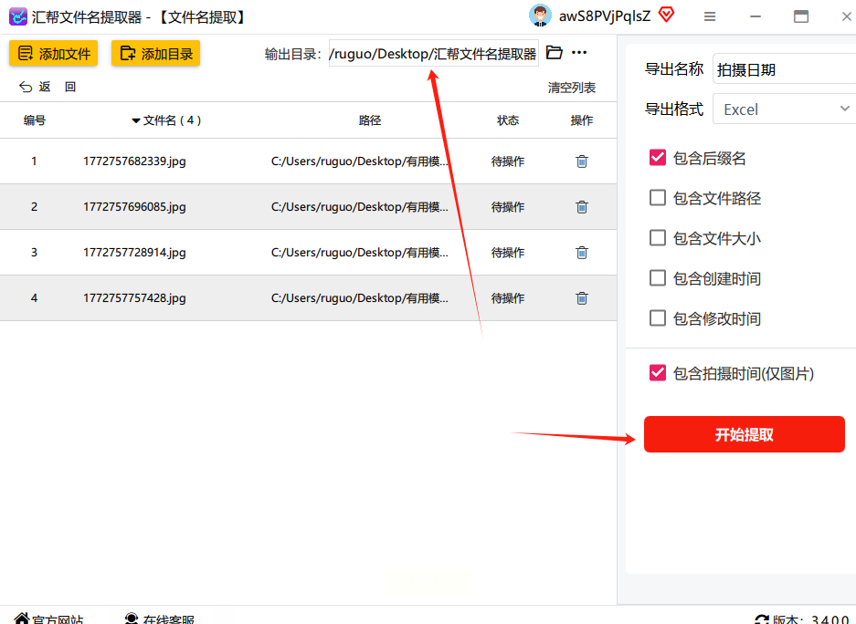 点击「开始提取」按钮,软件会自动扫描所有照片EXIF数据,生成Excel表格。