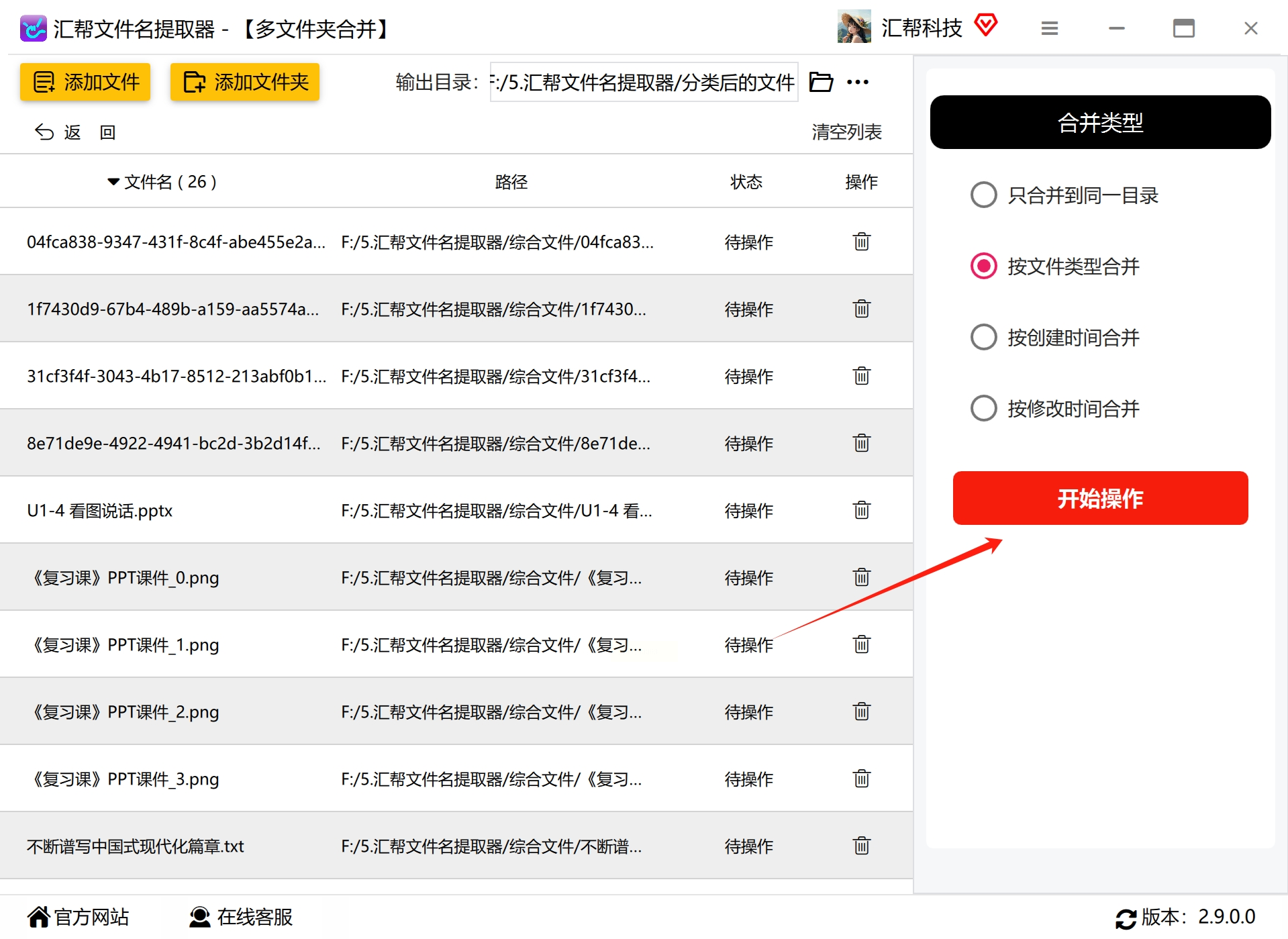 点击“开始操作”,软件会生成进度条,完成后所有文件会按类型整齐排列到目标文件夹。