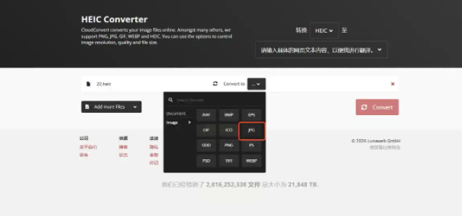 进入工具页面后,点击“选择文件”按钮,找到存放HEIC图片的文件夹,按住Ctrl键(Windows)或Command键(Mac)多选图片,点击“打开”。支持批量上传,一次最多可转换20张,对图片格式没有限制(也能转换JPG转其他格式)。