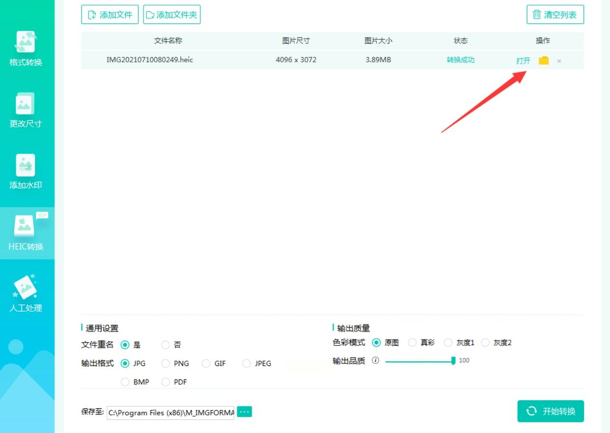 点击“开始转换”按钮,软件会自动处理所有导入的HEIC图片。转换过程中可以看到每张图片的进度,全部完成后,软件会提示“转换成功”,点击“打开文件夹”就能查看转换后的JPG文件。