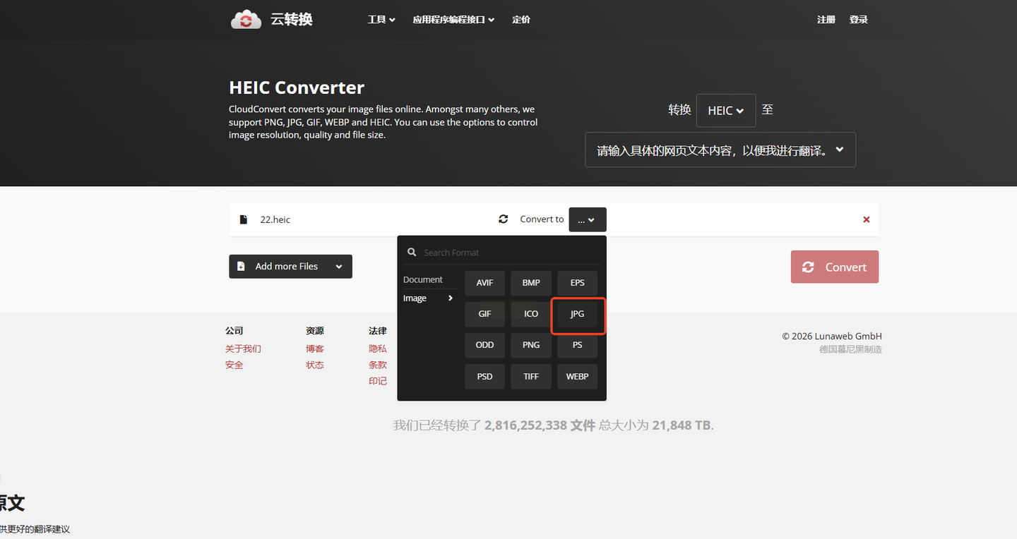 推荐理由:不用下载软件,直接在网页上就能转,支持的格式超多,HEIC、视频、文档啥都能搞。