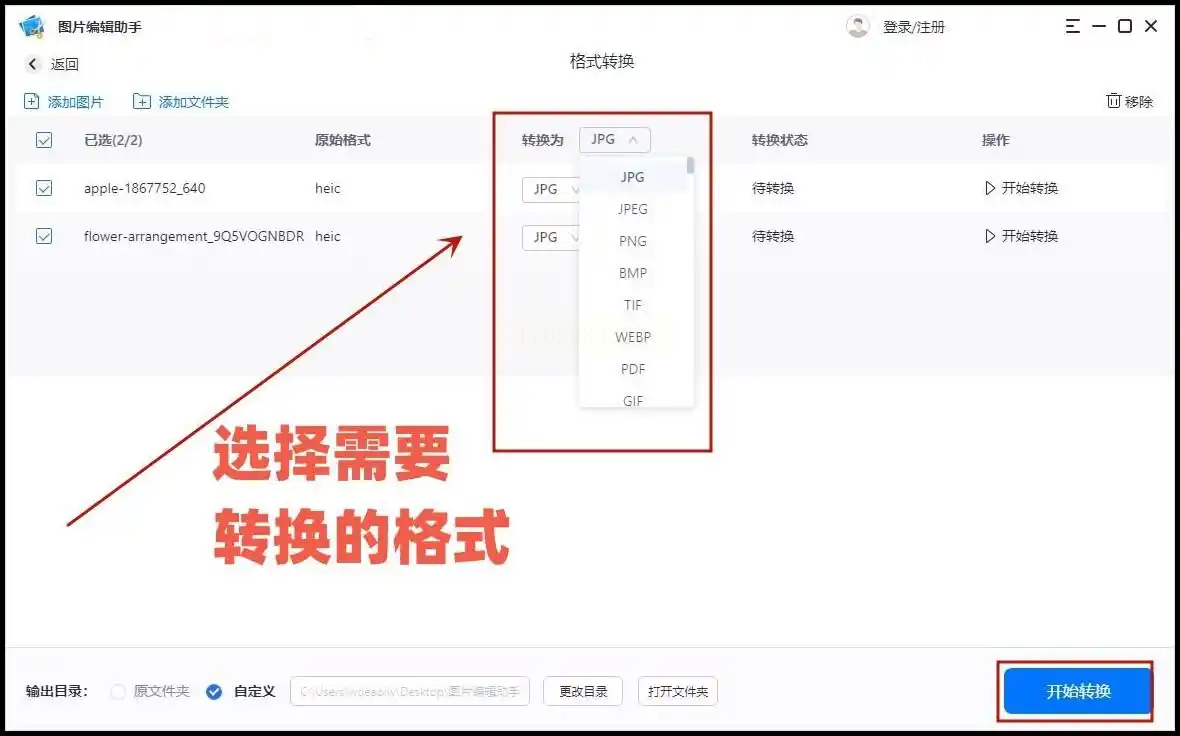 步骤三:图片添加成功后,在输出格式的设置选项里,选择“PNG”。最后,点击旁边的“开始转换”按钮,稍等一会儿,转换就完成了。