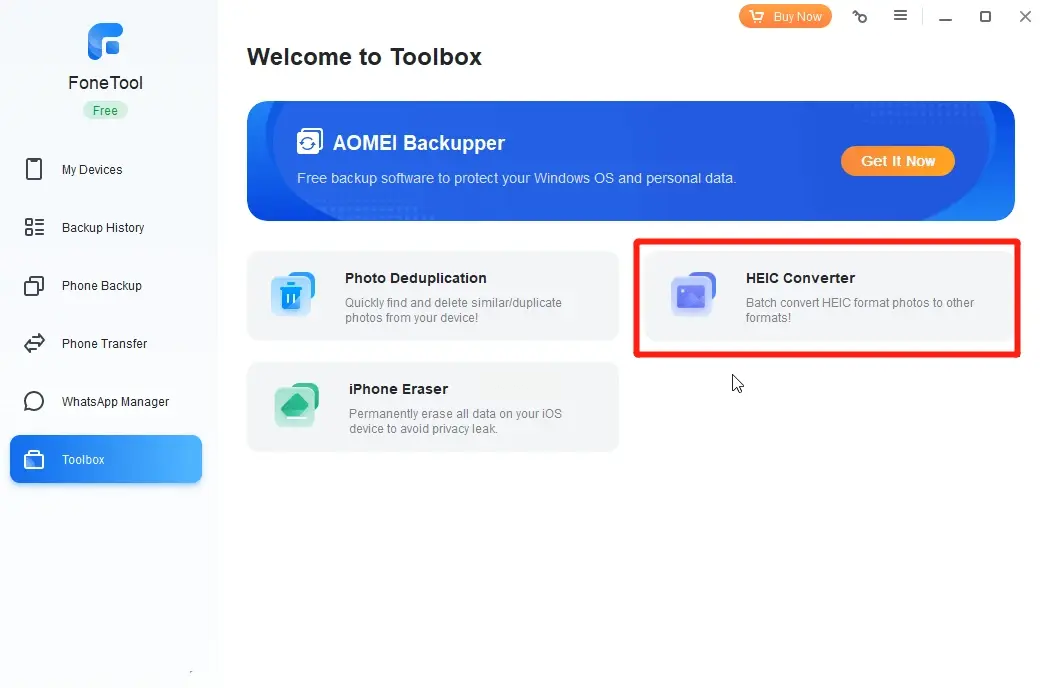 步骤一:在电脑上启动FoneTool软件,在主界面中找到并点击“工具箱”或“Toolbox”栏目,然后选择其中的“HEIC转换”功能。
