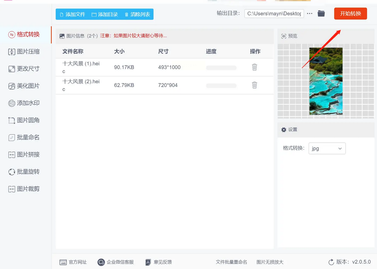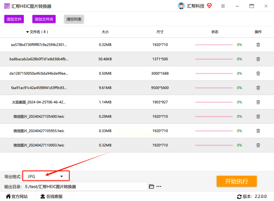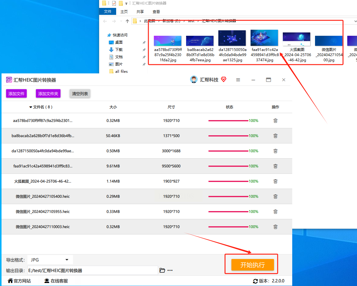 最后点右下角那个明晃晃的“开始运行”!进度条走完后,软件会自动弹出来输出文件夹——哇,所有HEIC图片已经变成JPG格式躺在那了!你直接复制到手机或发给别人,再也不会说“文件损坏”了~