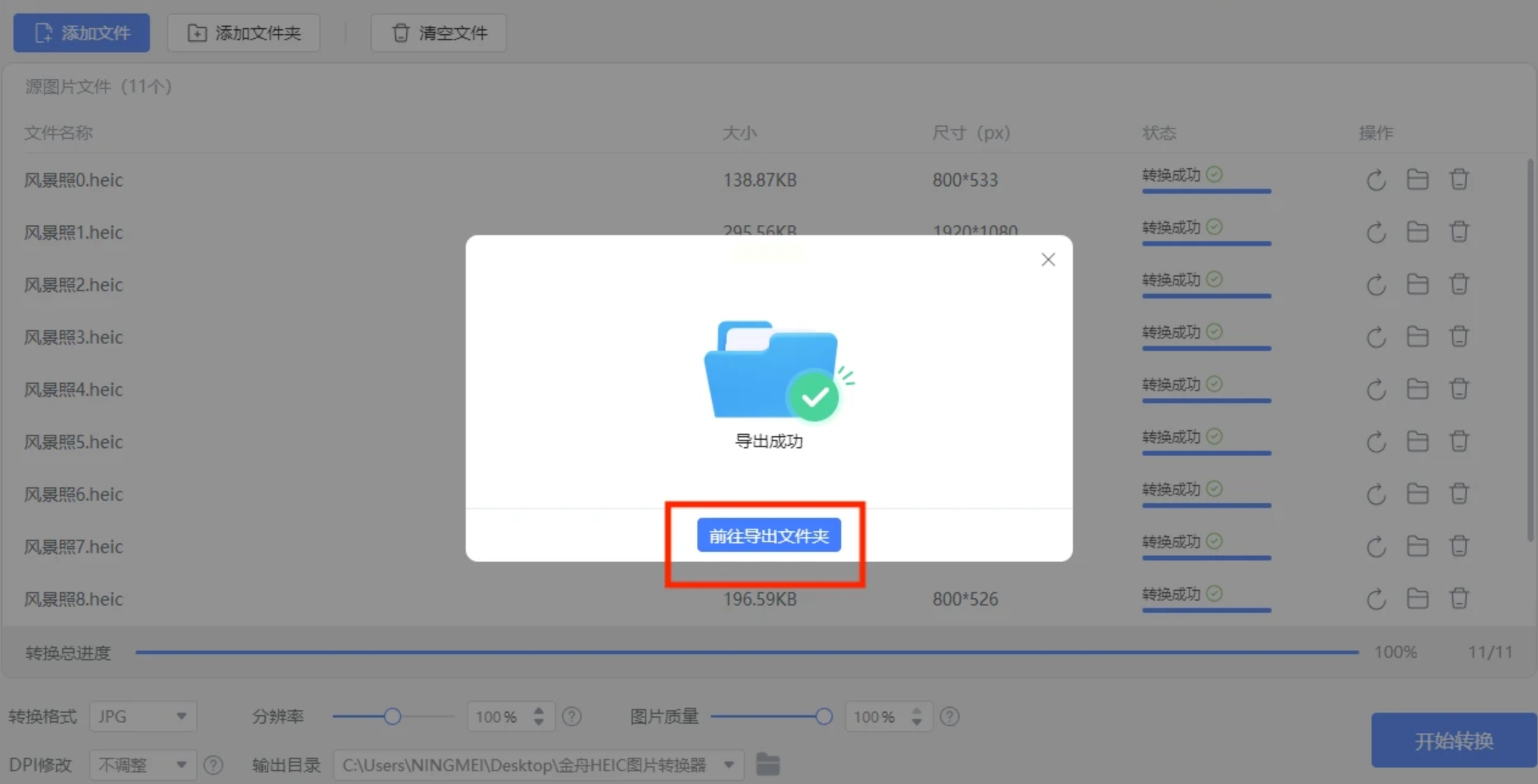 6. 等待进度条走完后,转换完成后,您可以点击“前往导出文件夹”或直接在设置的输出路径中查看生成的JPG图片。