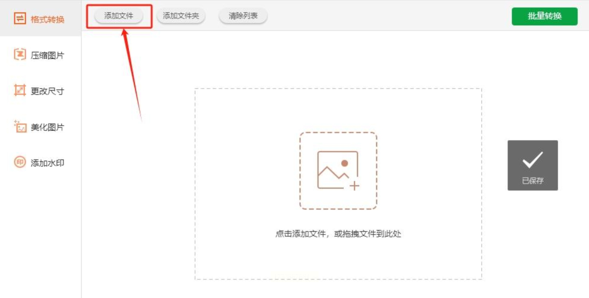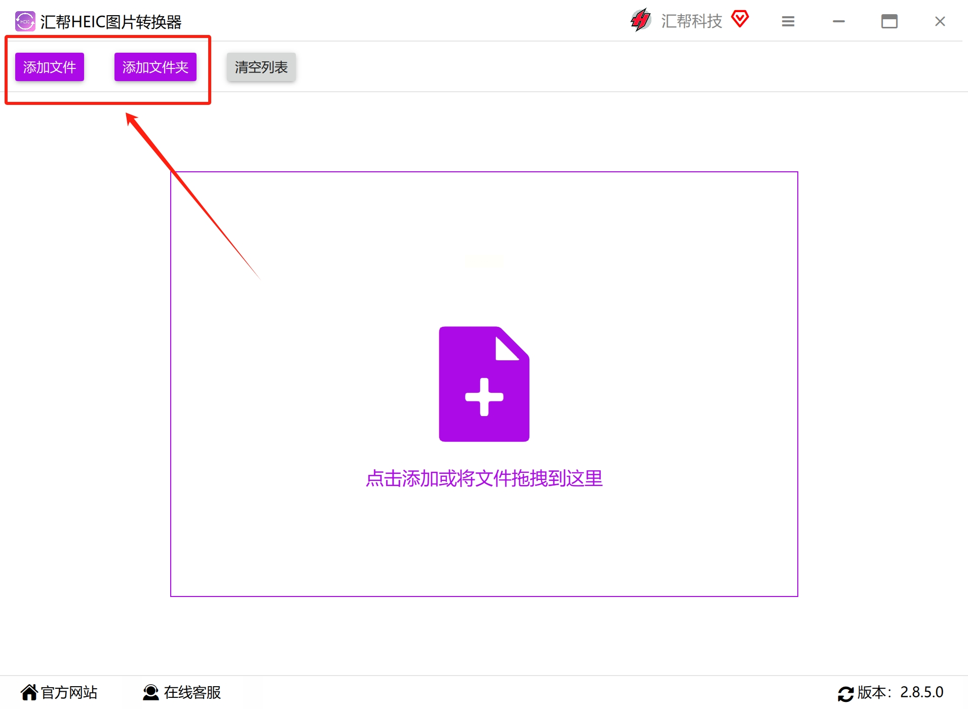 2. 添加文件:点击界面中央的"添加文件"或"添加文件夹",选择要转换的HEIC图片(支持Ctrl多选或直接拖文件夹)。如果照片太多,建议先按日期/相册分类文件夹,转换更清晰。