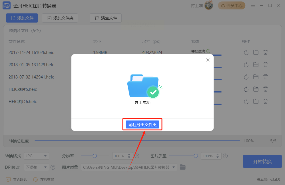 3. 开始转换:点击「全部转换」按钮,等转换完成(左下角会显示“转换成功”),点击「打开文件夹」就能看到所有JPG图片了;