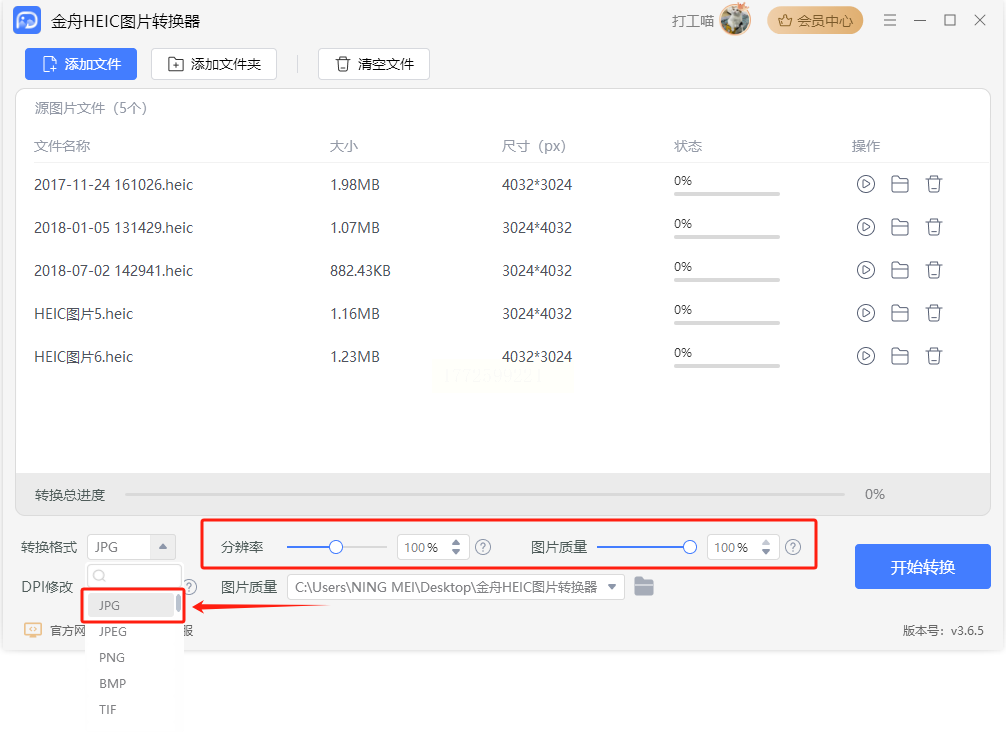 这个方法最适合:想把HEIC转成JPG时,还能调整图片大小(比如发朋友圈需要压缩尺寸),但软件操作也很简单。