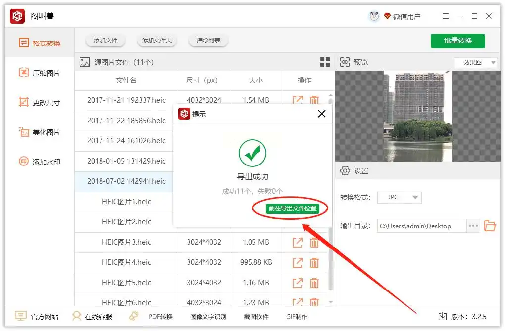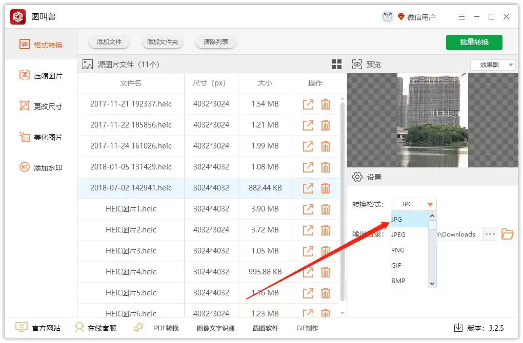 优势:支持HEIC批量转换+EXIF信息保留,同时可预览原图与转换后对比,适合专业摄影爱好者。