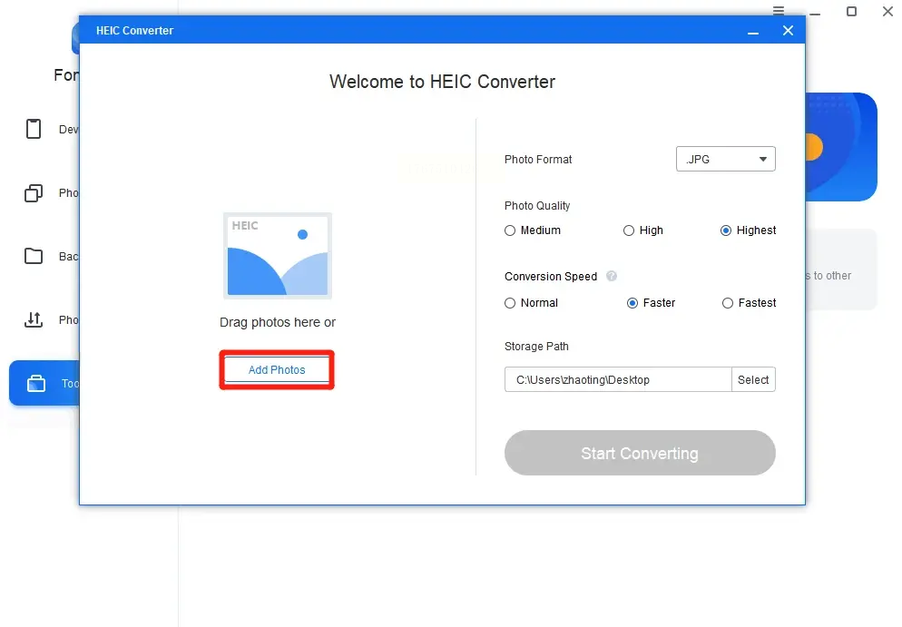 1. 打开FoneTool后,点击左侧「Toolbox」→「HEIC Converter」。