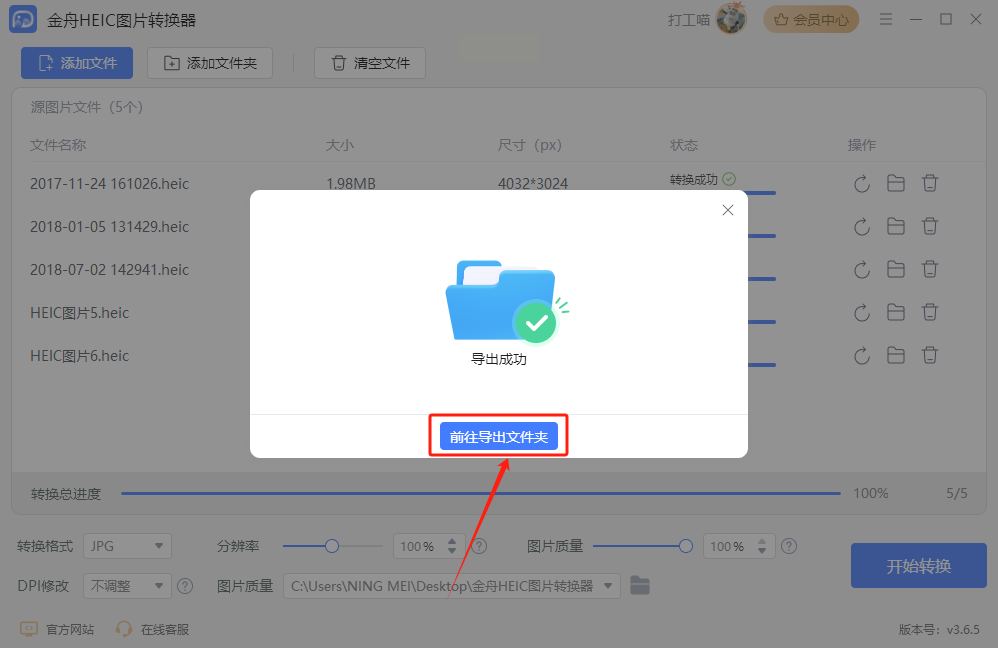步骤三:点击"全部转换"按钮,等待进度条完成。转换完成后会自动弹出文件夹,可按修改时间或名称快速定位新生成的jpg文件。