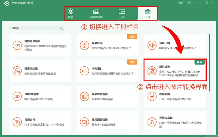 步骤一:安装后进入主界面,点击左上角"工具"模块进入HEIC转换专区。支持拖拽或点击"添加文件"导入图片,支持多格式批量导入。
