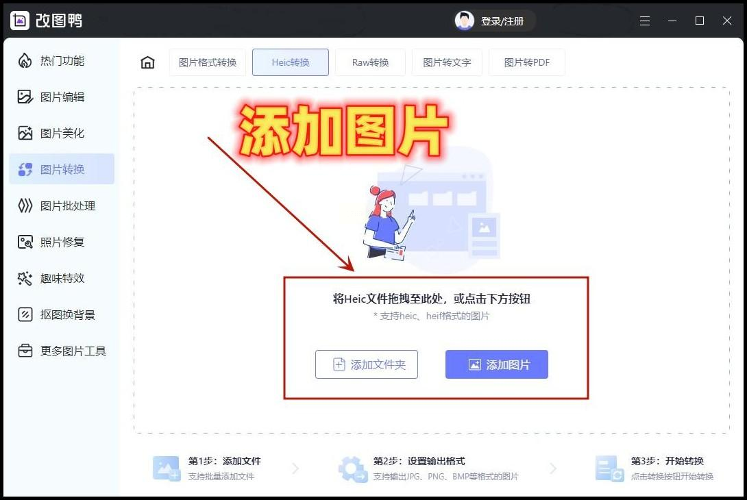 3. 上传图片:点"添加图片",从电脑里选HEIC文件,或者直接拖进去