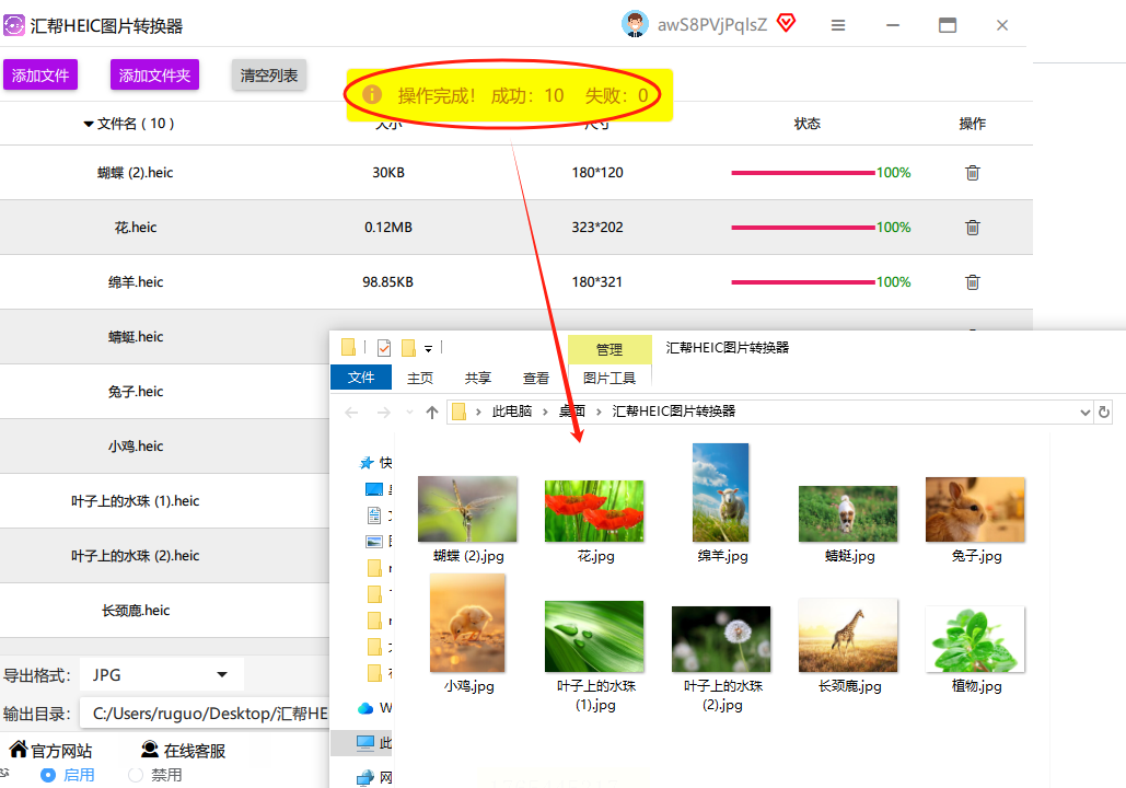 4. 等结果:转换完会自动提示"转换成功",然后就能在指定文件夹里找到新的JPG文件啦