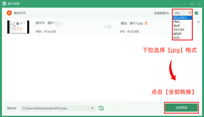 3. 设置格式:右上角点格式下拉框,选JPG,再点"全部转换"