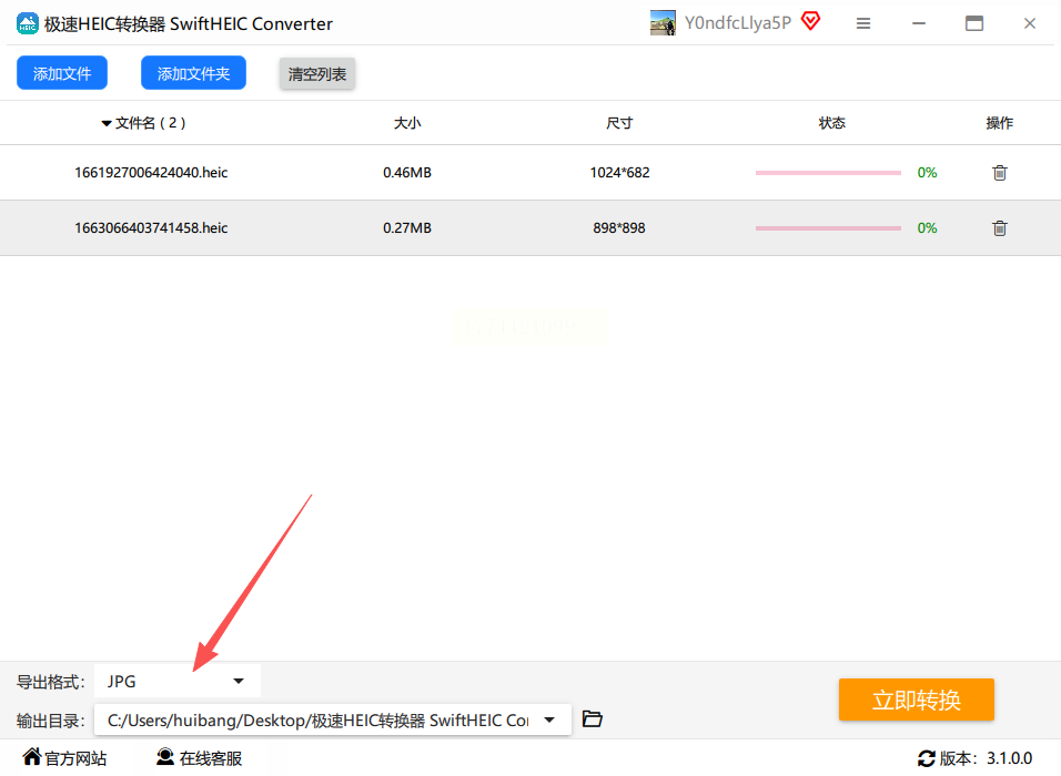 4. 在输出格式中选择目标格式(如JPG),可根据需要调整图片尺寸和质量。