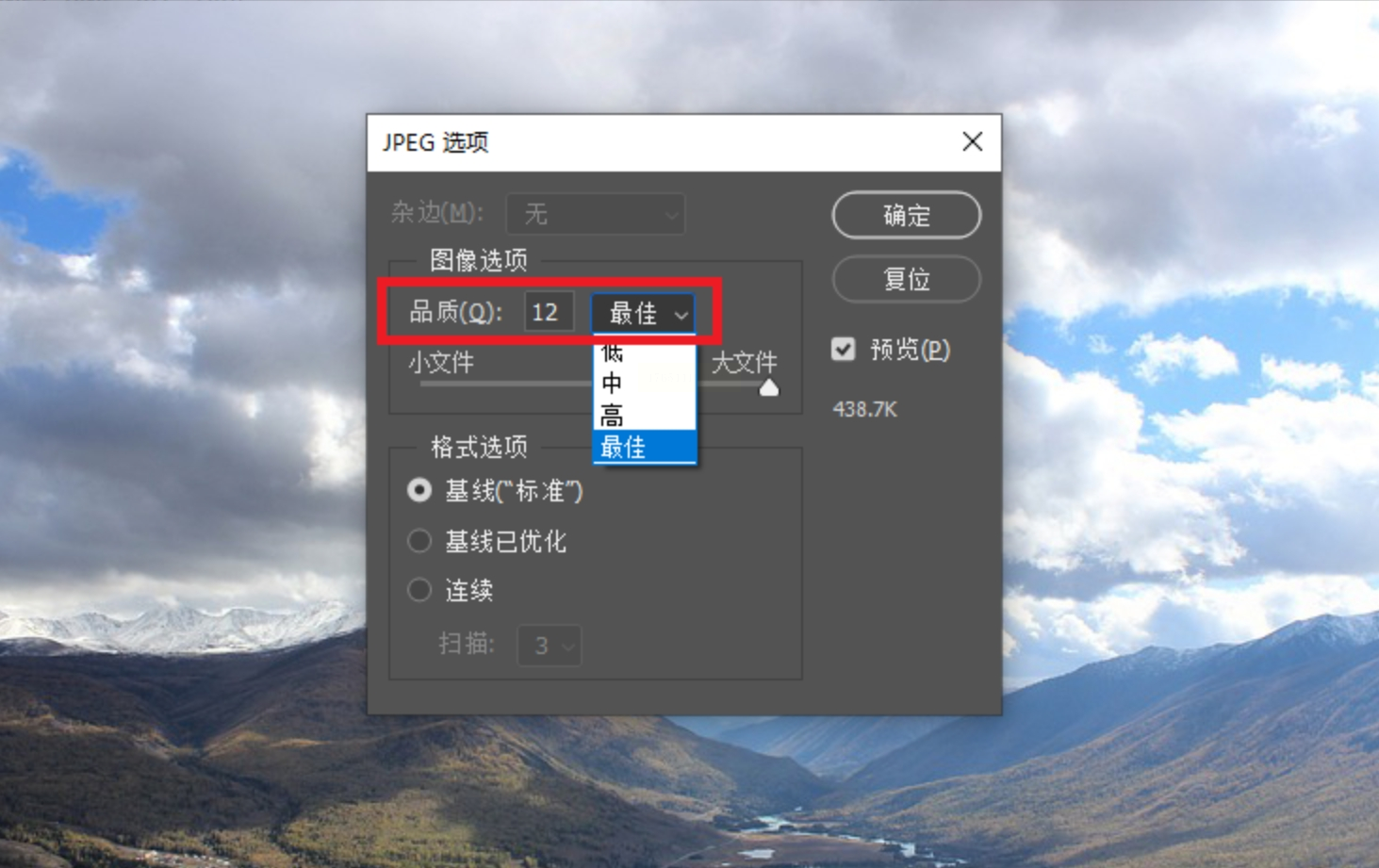 - 弹出JPEG选项窗口,把“品质”滑块拉到最高(12左右),色彩模式选“RGB”,其他参数默认即可,点击“确定”。