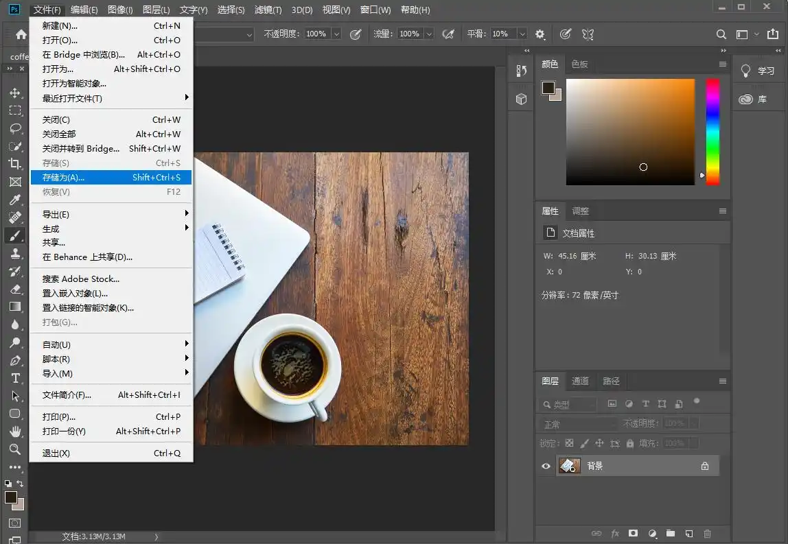 步骤二: 图片在Photoshop中打开后,再次点击菜单栏的“文件”,这次选择“另存为”或者“导出”菜单下的“快速导出为PNG”。