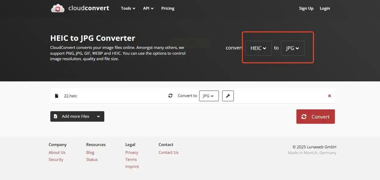 2. 点「Select Files」选本地HEIC文件,或者从Google Drive、Dropbox等云端导入