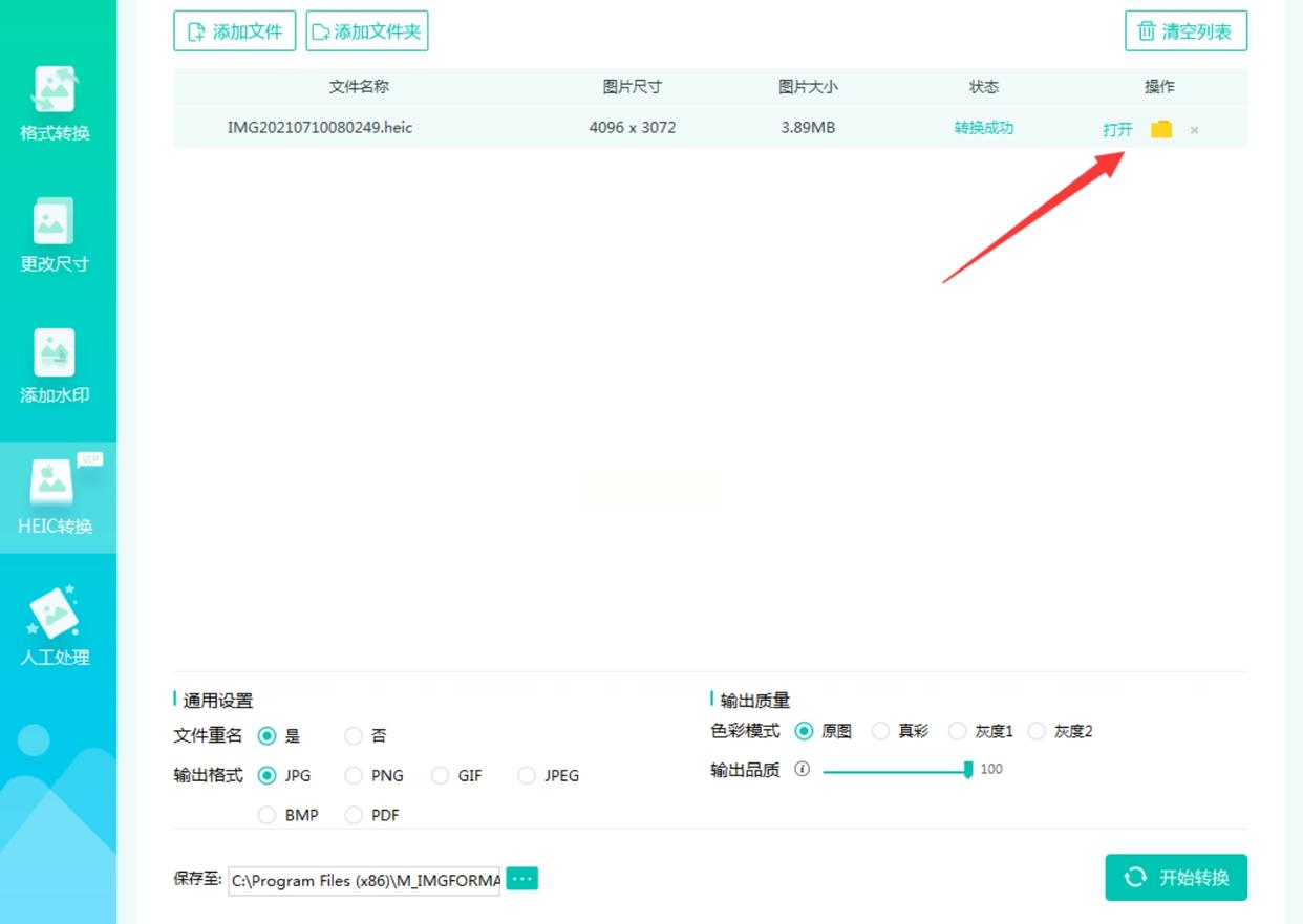 点击“开始转换”按钮,进度条走完后,软件会提示“转换完成”。这时候点击“打开输出文件夹”,就能看到转换后的JPG图片,双击检查是否正常。
