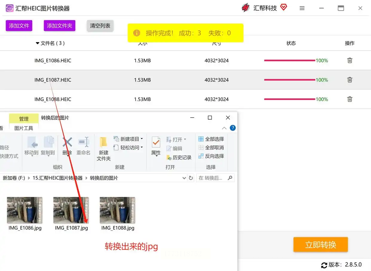 点击右上角的「批量转换」按钮,软件会开始处理所有图片。转换完成后,界面会显示“转换成功”的提示,点击“前往导出文件夹”就能找到所有JPG图片。