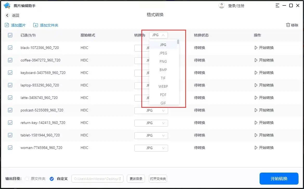 步骤二:在界面下方找到输出格式区域,从列表中选择“JPG”格式。如果你需要对某张图片进行精细调整,可以双击列表中的该图片缩略图。