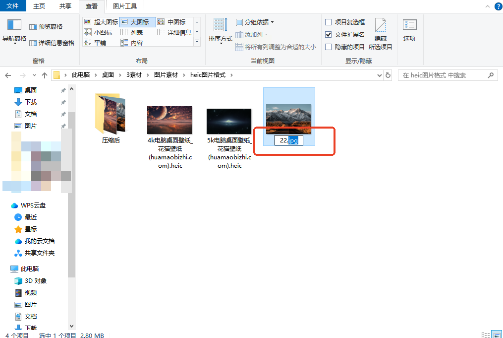 2. 然后右键点击图片,选“重命名”(或者按键盘上的F2快捷键),把“.heic”删掉,改成“.jpg”。