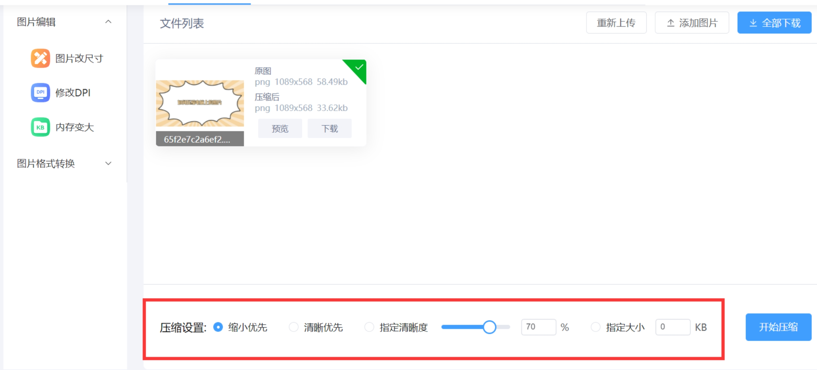4. 设置完成后,点击“开始压缩”按钮,系统将自动处理图片。完成后可直接下载到本地。