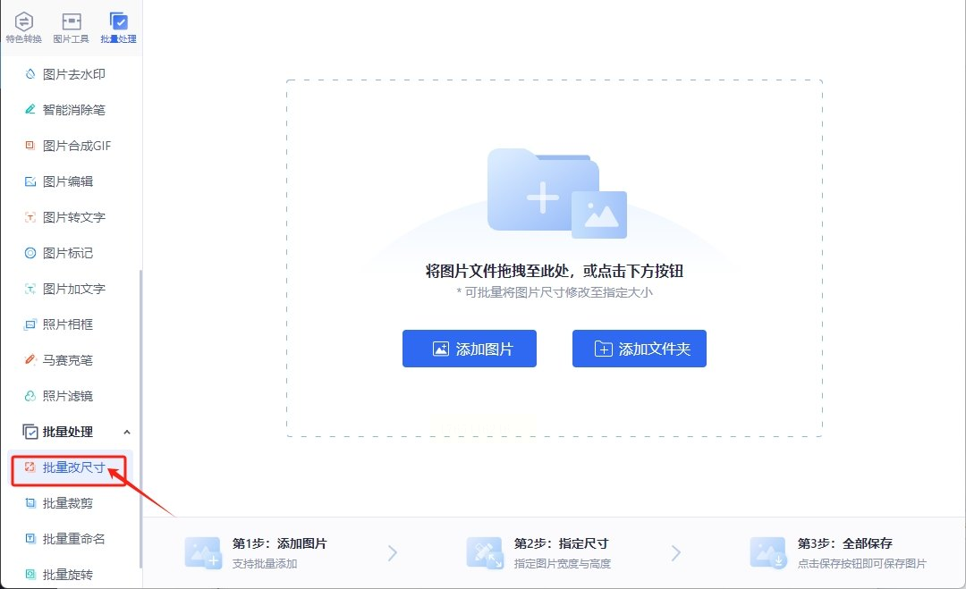1. 在电脑上运行“图片处理大师”软件,从主界面左侧功能栏中点击“批量改尺寸”进入相应模块。