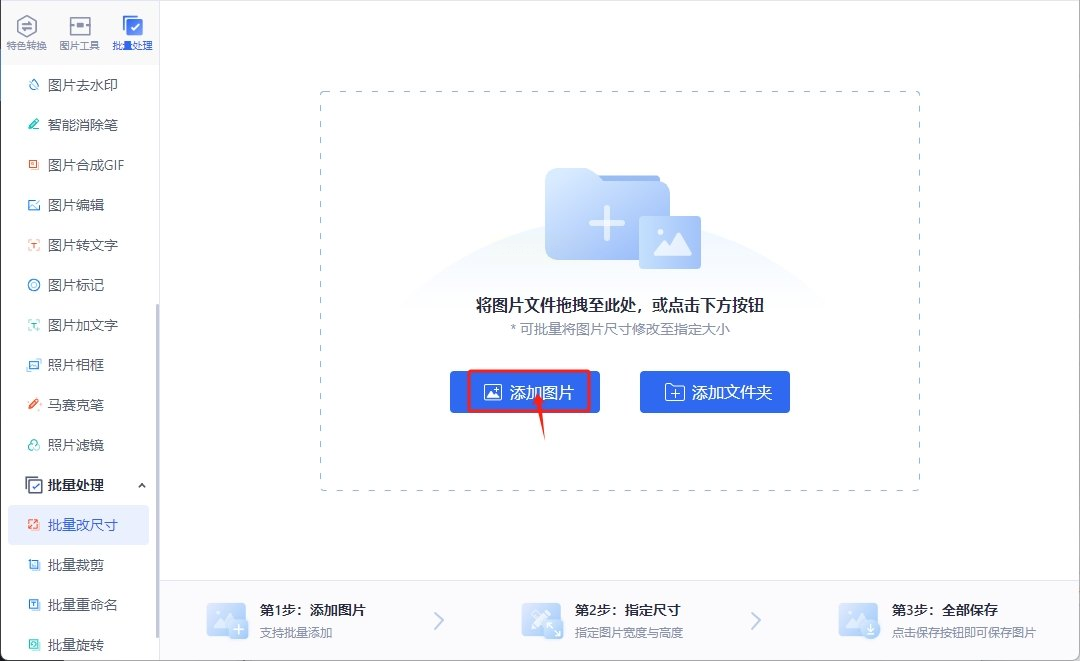 2. 点击页面中的“添加图片”按钮,导入需要处理的一张或多张图片。软件支持常见图片格式。