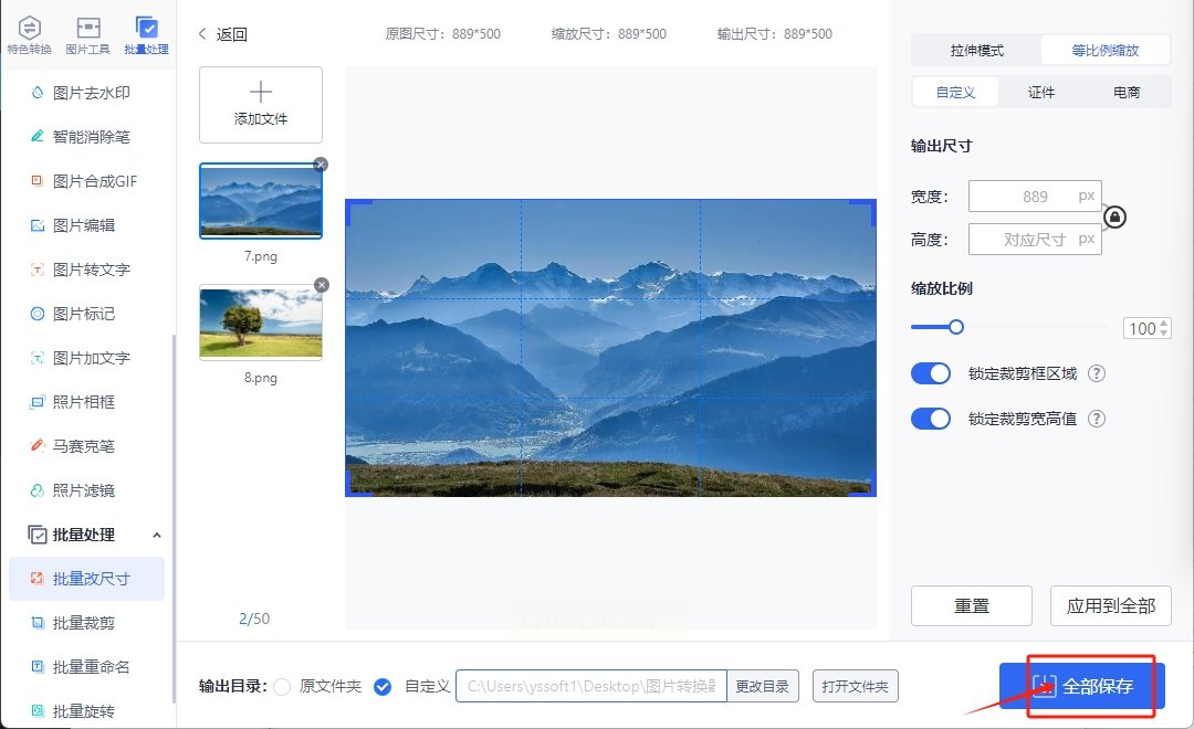 4. 设置完成后,点击右下角的“全部保存”按钮。在弹出窗口中选择输出文件夹路径,软件将自动执行缩小操作并保存新图片。