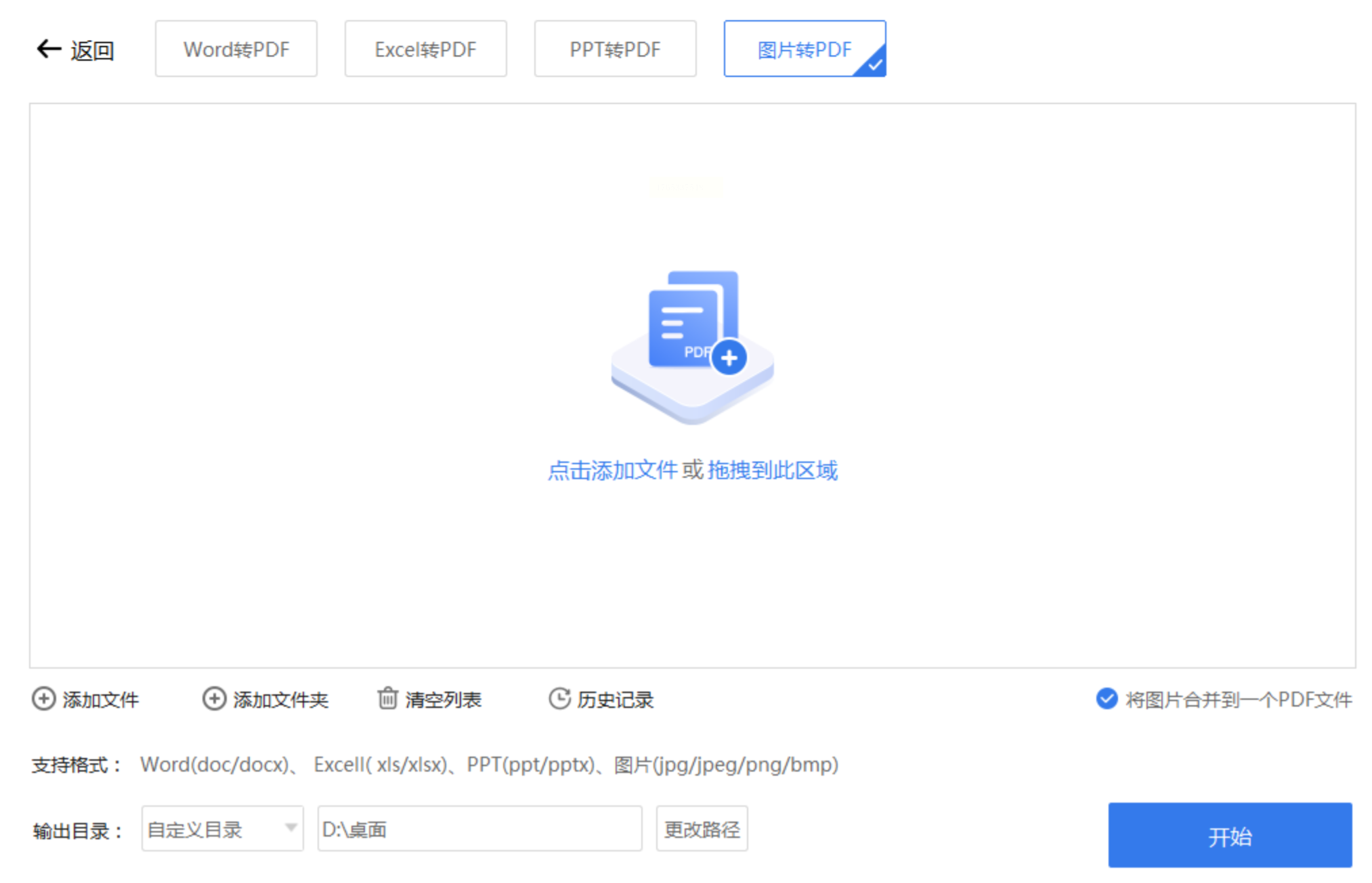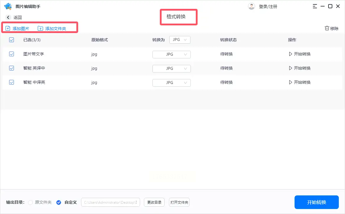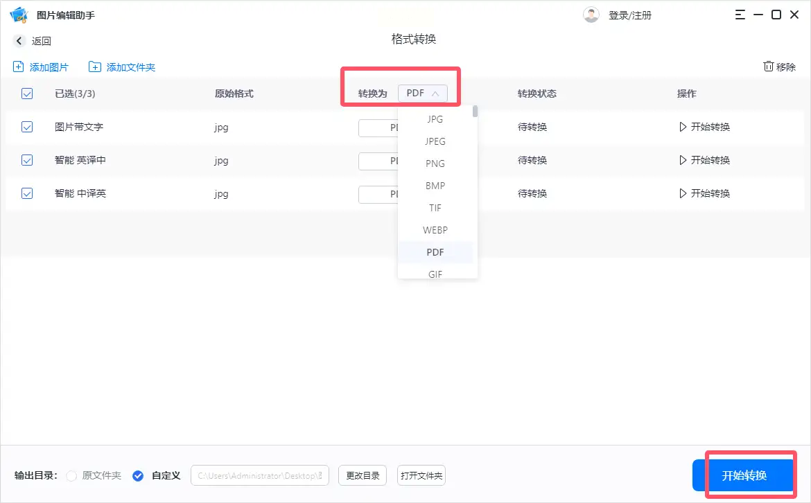 步骤三:检查图片列表和顺序,根据需要选择是否合并输出。确认后,点击“开始转换”即可等待结果。