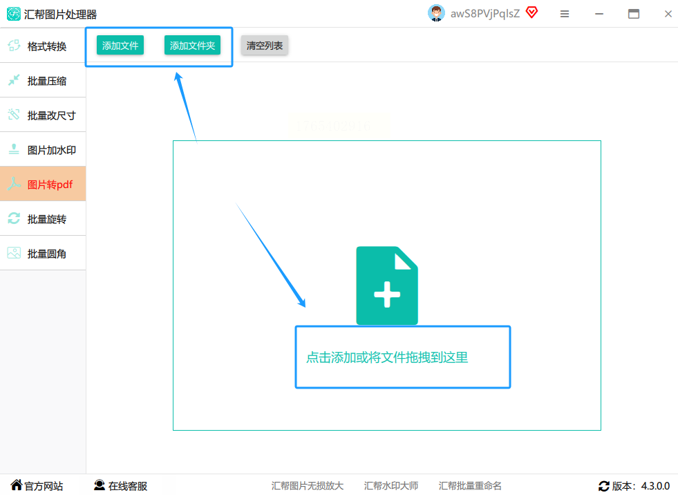 进入后,在左侧的格式列表中,精准地找到并点击 “图片转PDF”。然后,通过“添加文件”或“添加文件夹”按钮,把图片素材导入进来。这里的列表管理功能可能更强大,方便你预览和调整顺序。