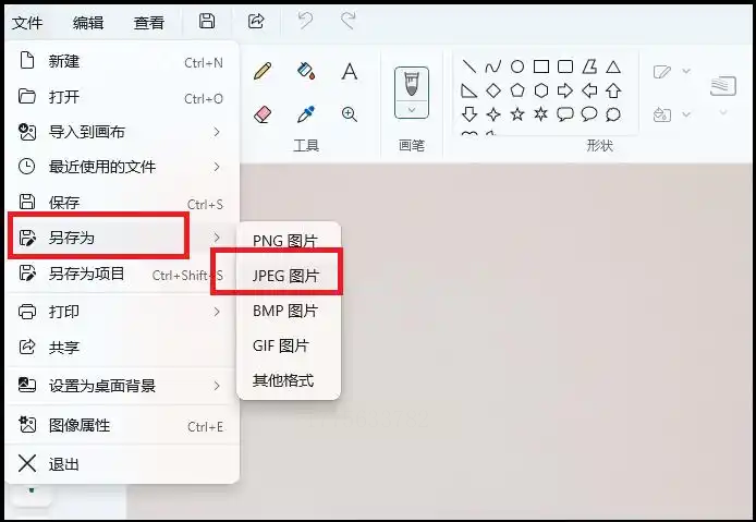 2. 图片在画图工具里打开后,点左上角的“文件”菜单,里面有个“另存为”,点进去后,格式那里选“JPEG图片”(注意不是“PNG”哦)。