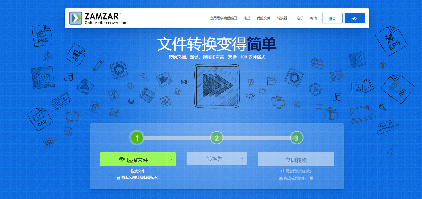 1. 打开zamzar网站(直接在浏览器输入网址,比如https://www.zamzar.com/),首页会有“选择文件”的按钮,点它。