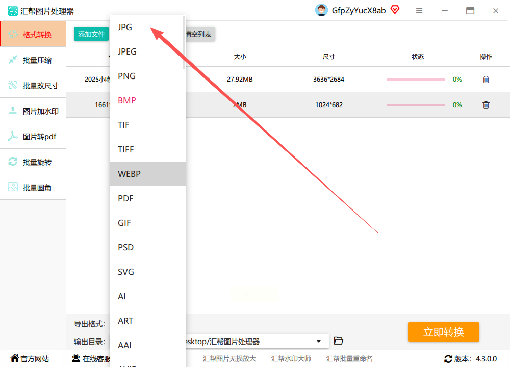 3. 上传后,在格式设置里选“JPG”,然后点“立即转换”按钮,网站会开始处理你的文件。