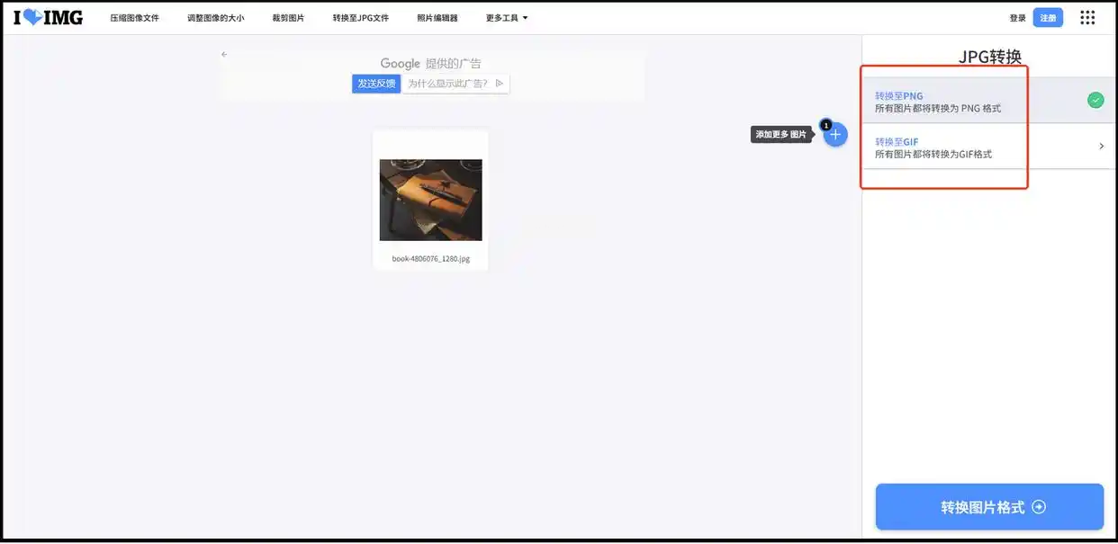 3. 上传后,在格式选项里选“JPG”,然后点“转换”按钮,等一会儿转换完成。