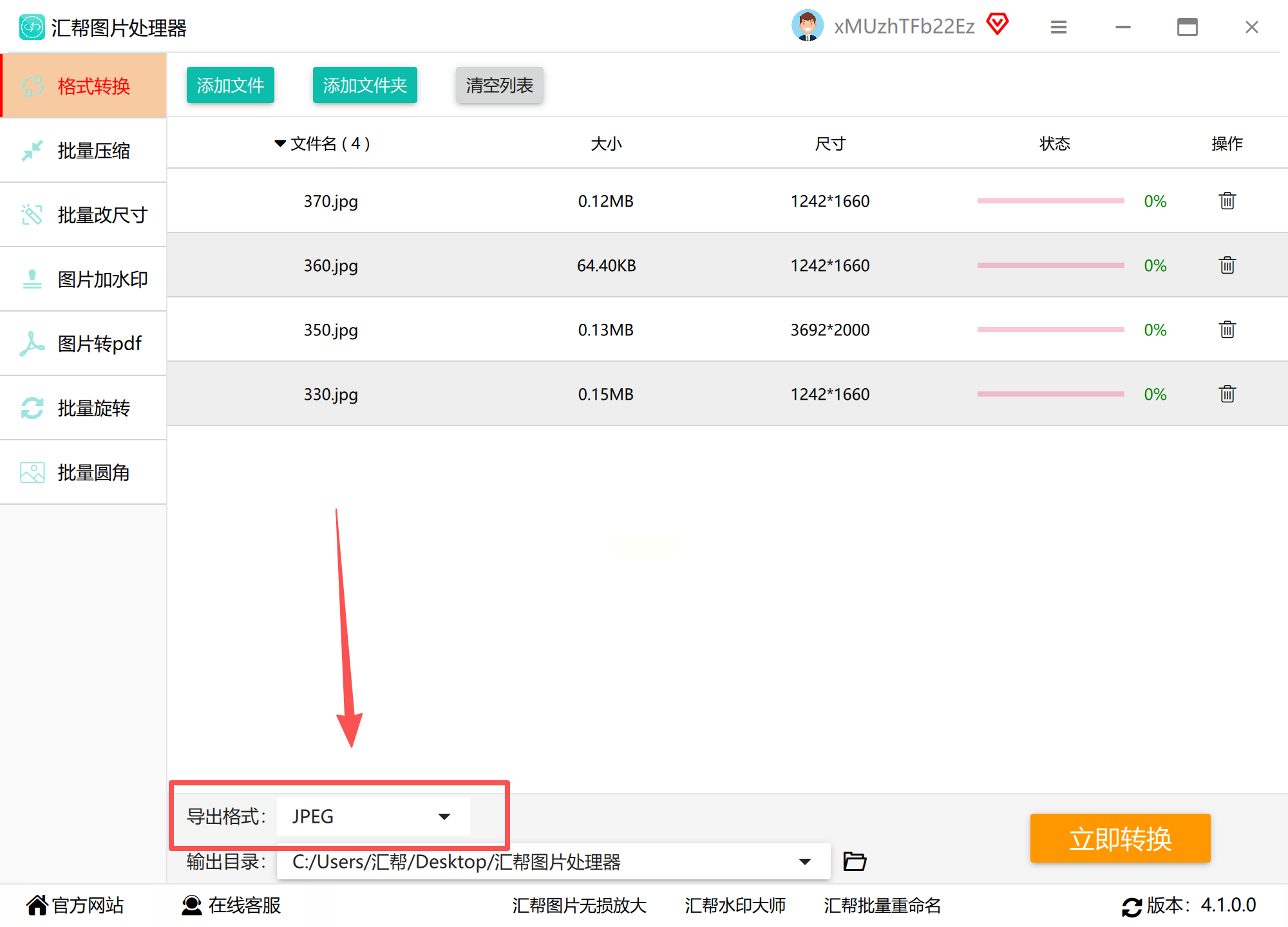 2. 选择输出格式:在右侧“格式设置”中,下拉选择“JPEG”,可同时设置输出尺寸、压缩率等参数。