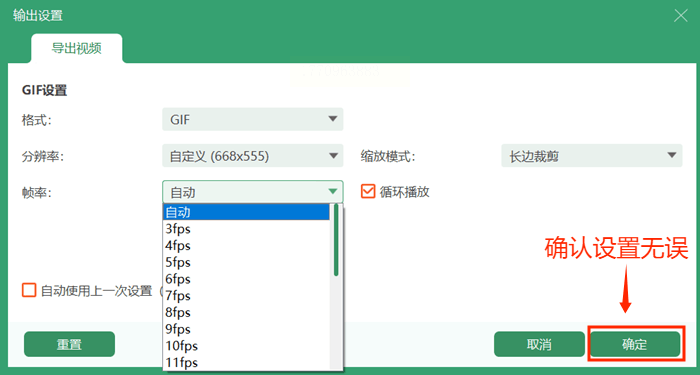 3. 格式设置:在右侧参数区选择“导出格式”为GIF,软件默认输出为循环播放格式,若需调整帧速率或尺寸,可点击“高级设置”按需修改。