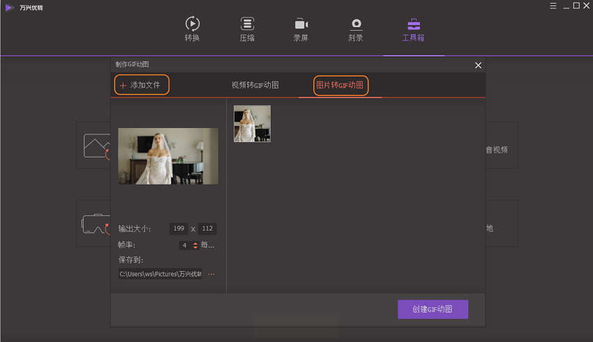 2. 添加素材:选择“图片转GIF”模式,点击“+添加文件”导入本地JPG,支持一次性添加多个文件并按导入顺序排列。