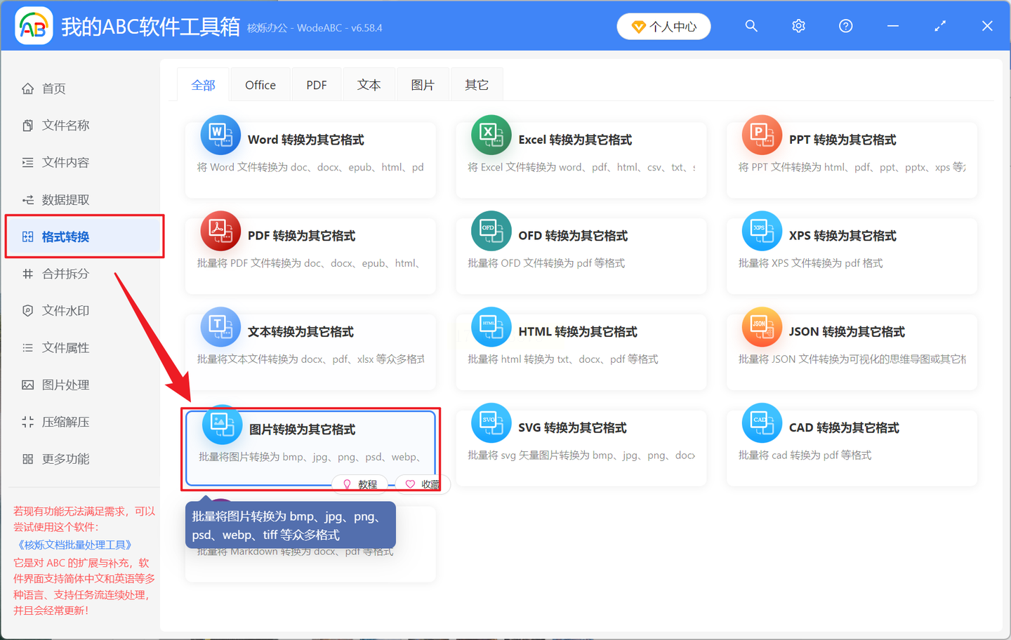 1. 功能定位:打开软件后,在左侧菜单栏选择“格式转换”→“图片转换为其他格式”,进入图片转换专区。
