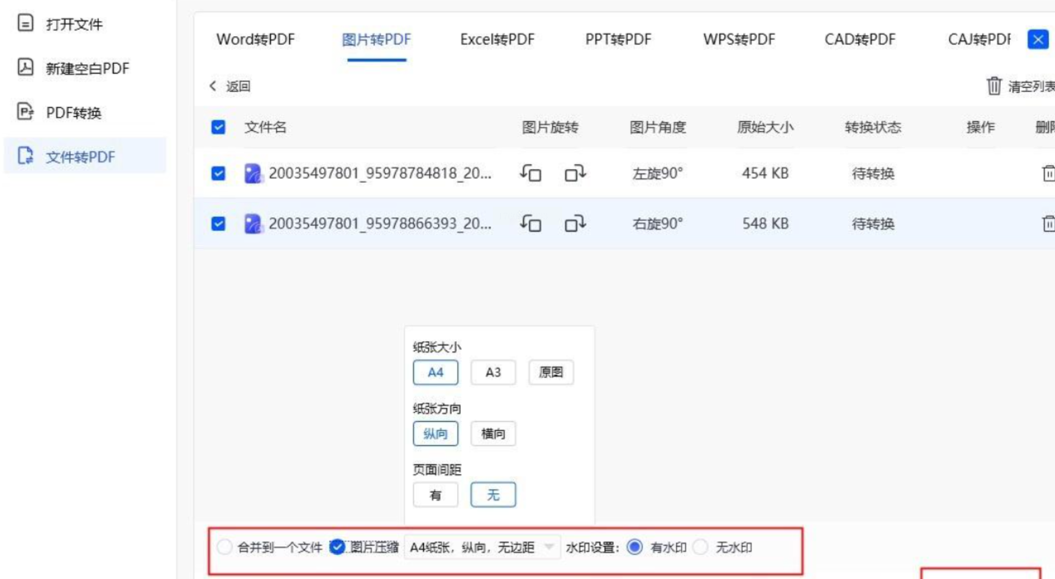 3. 设置转换参数:选择纸张尺寸(支持自定义宽高)、方向、压缩质量(高/中/低三档)。