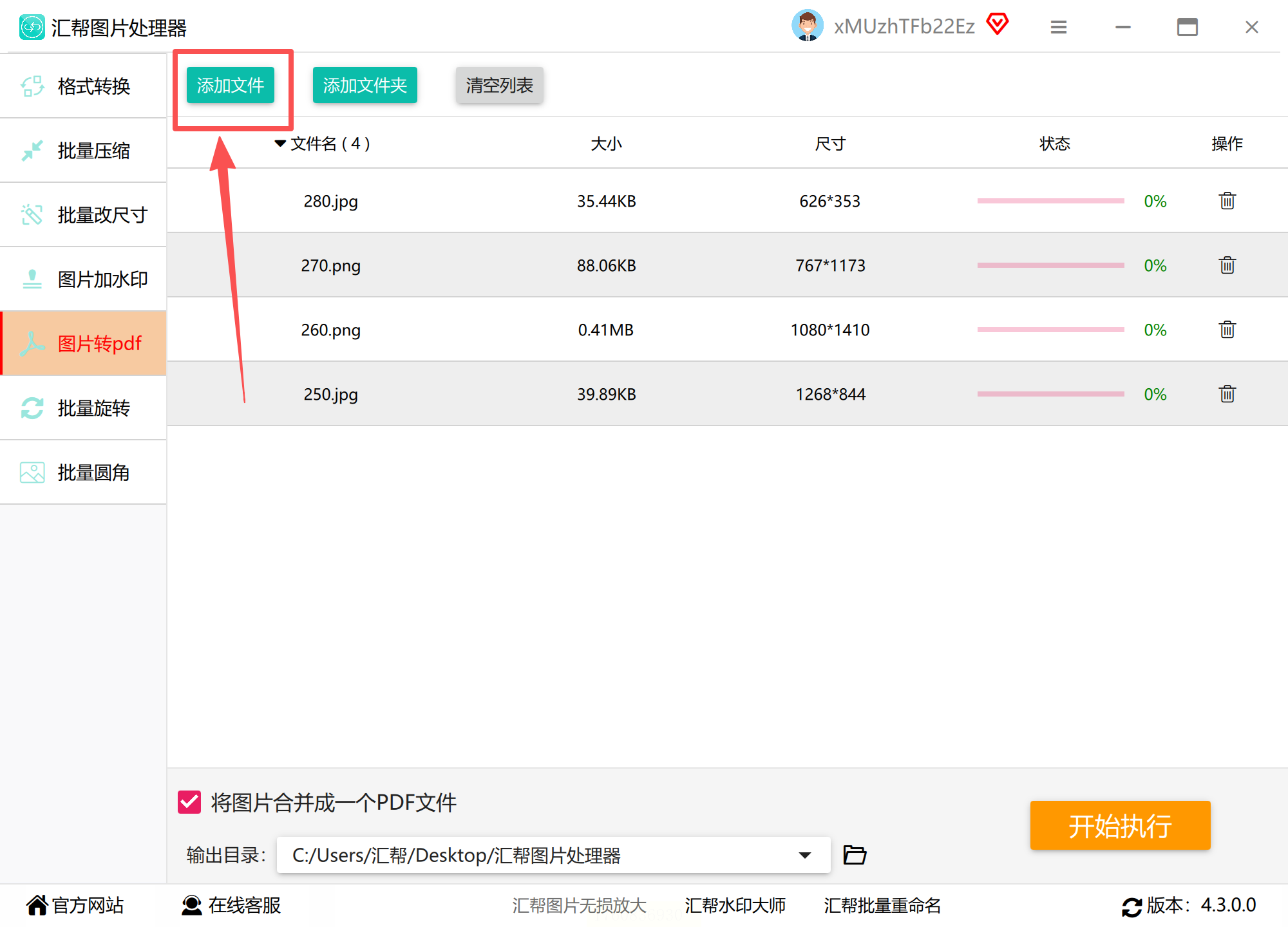 2. 文件导入设置:点击"添加文件"按钮,支持通过文件浏览或直接拖拽两种方式导入图片。对于超过20张的图片集合,系统提供"批量导入"模式,可按文件夹层级快速筛选指定格式文件(默认支持JPG/PNG/BMP等常见格式)。