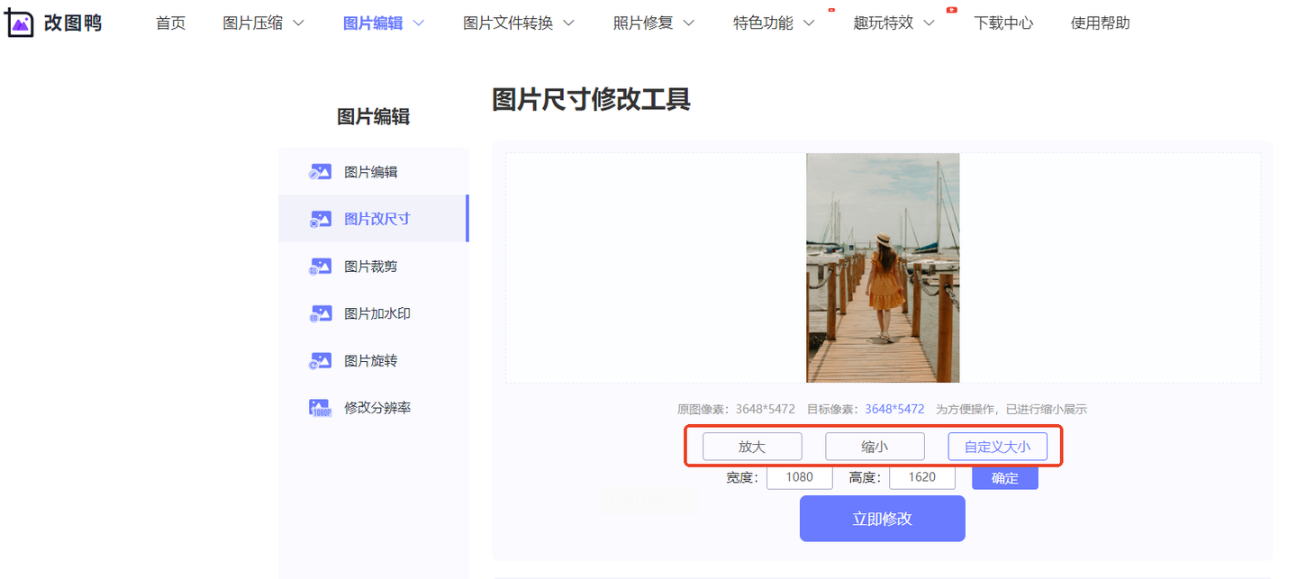 步骤一:打开改图鸭网站,点击“图片改尺寸”功能。上传你的图片,网站支持JPG、PNG等常见格式。