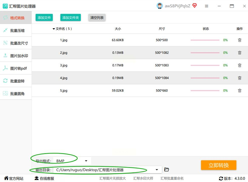 3. 选择格式:在右侧“输出格式”下拉菜单中选择“BMP”,可同时设置“覆盖原文件”或“保存到新文件夹”选项。