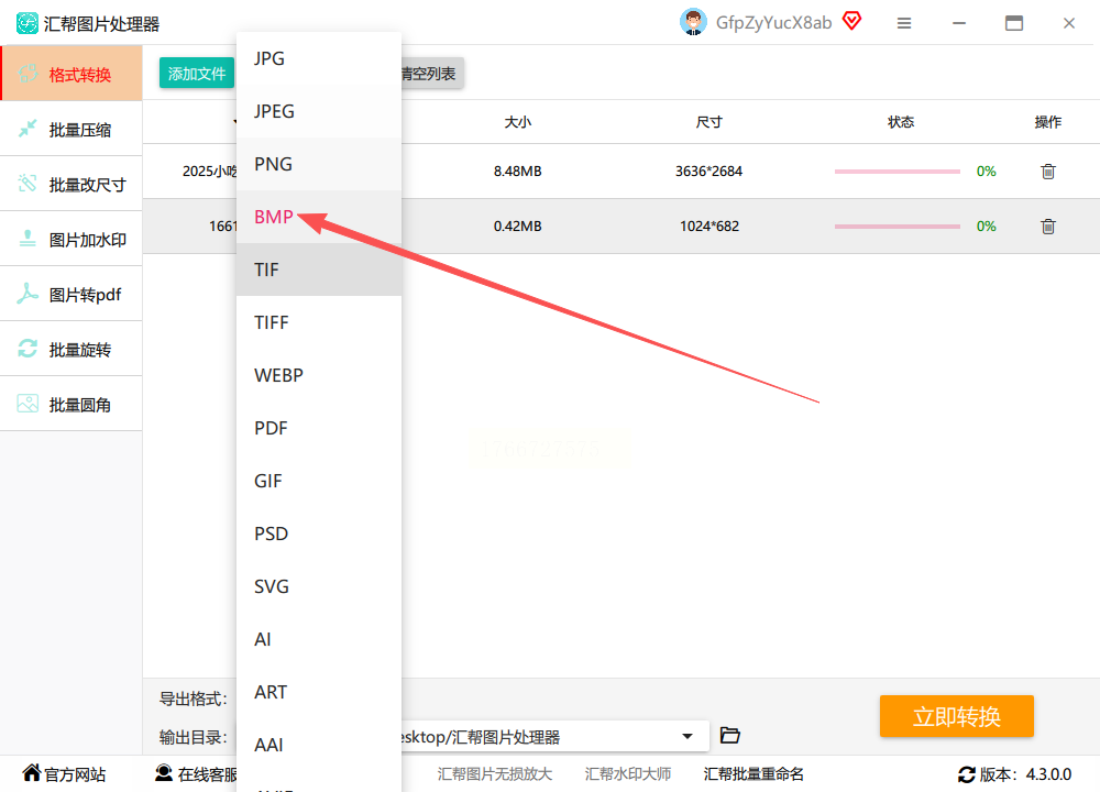 步骤四:在格式下拉菜单中,软件提供了丰富的选项。从中找到并选择“BMP”格式。