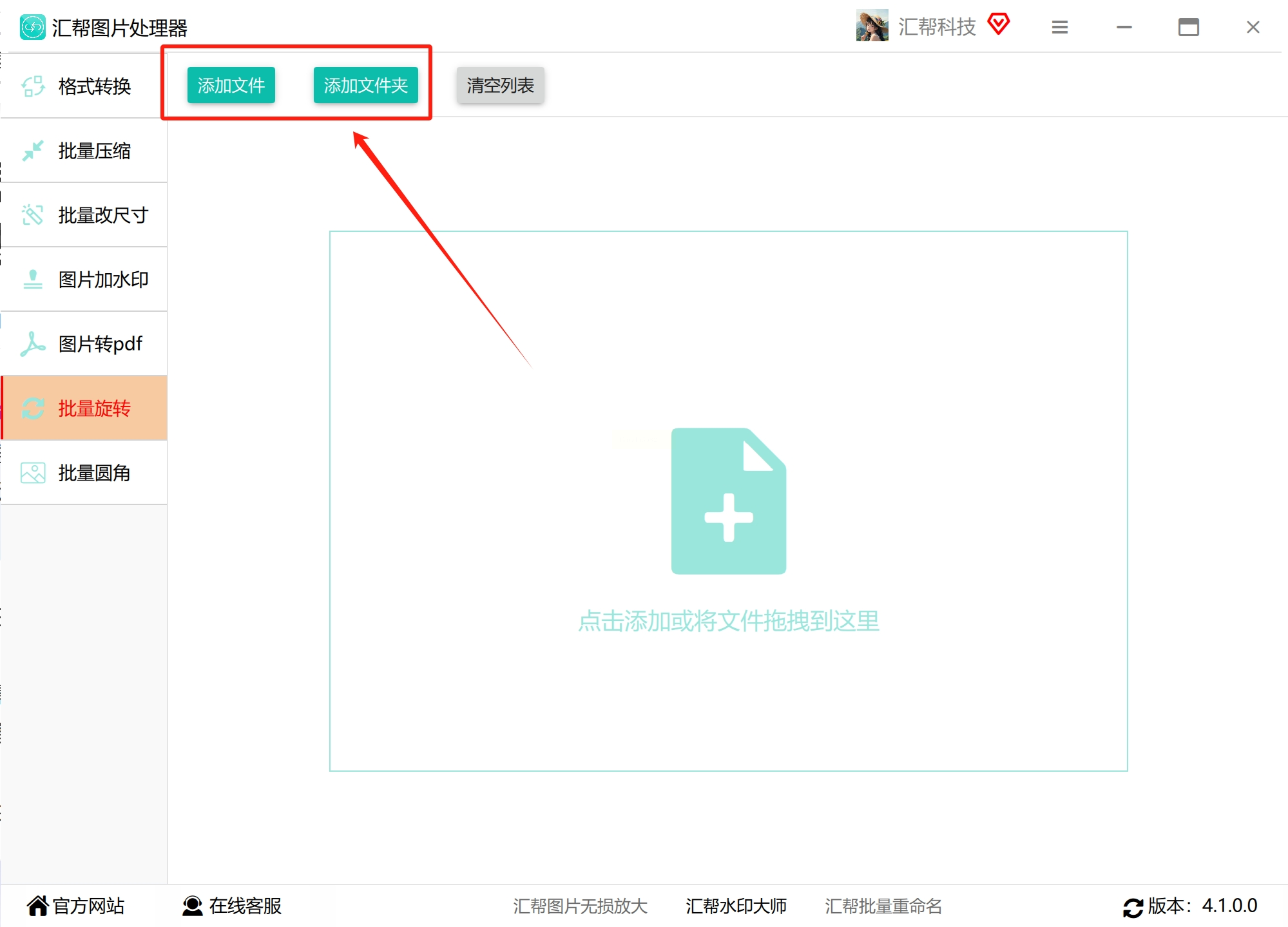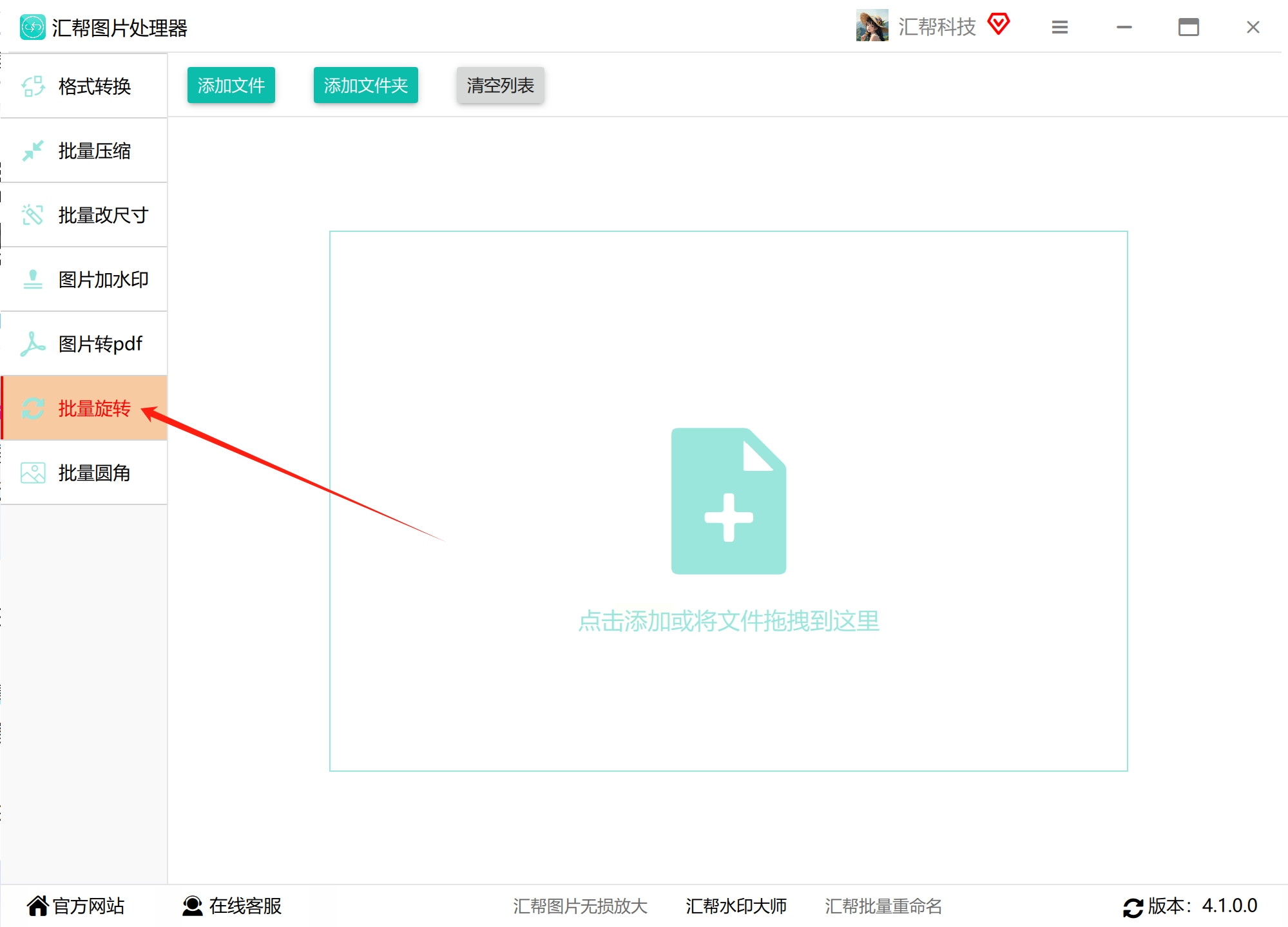 打开软件后,你会看到左侧有一排功能选项。我们需要的是“批量旋转”功能,点击它。