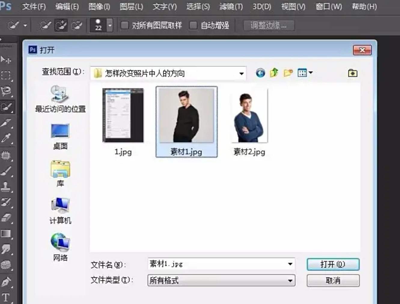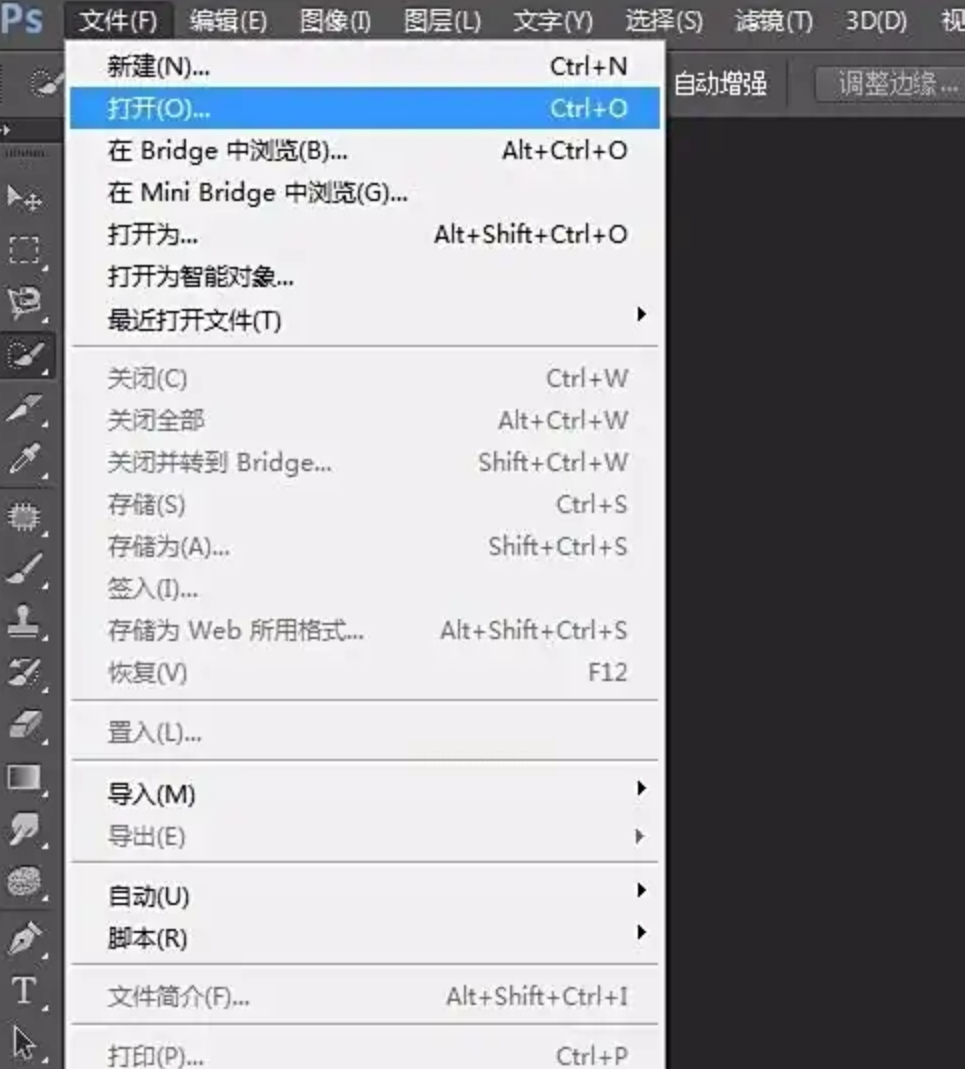 启动ps,点击菜单栏的“文件” → “打开”,然后找到你需要翻转的图片,选中后点击“打开”。