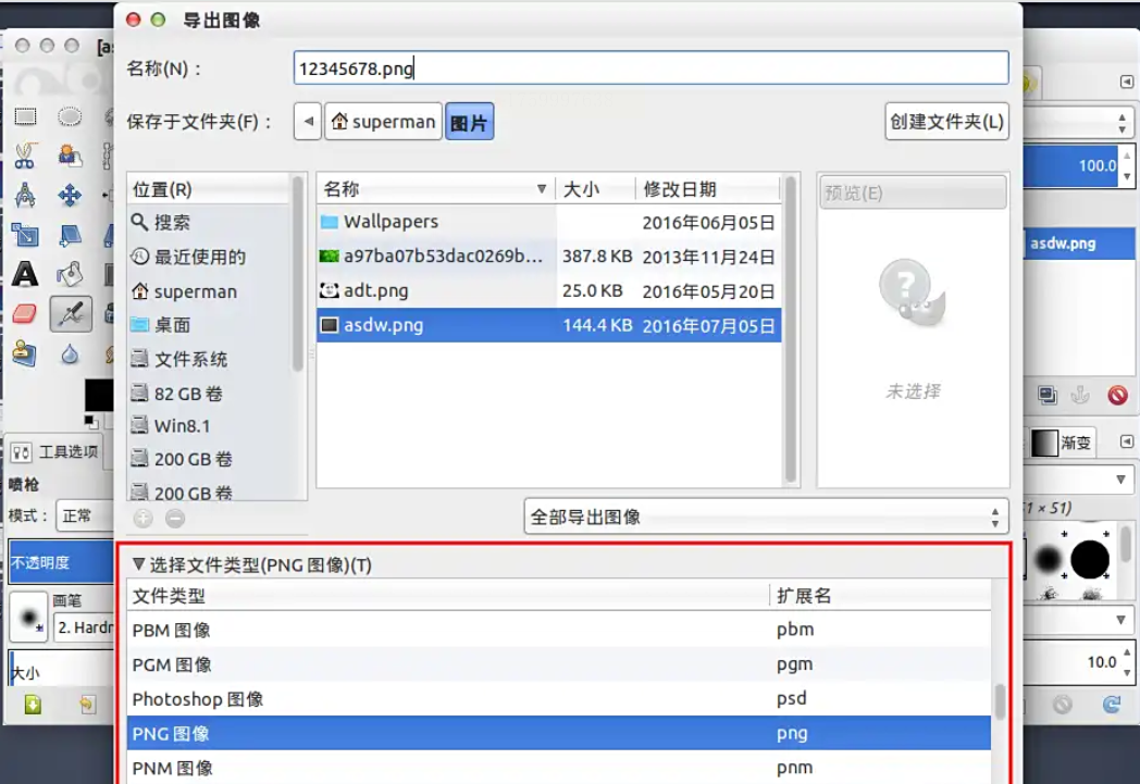 - 为文件命名并添加`.png`扩展名,或在「选择文件类型」中直接选择「PNG图像」。